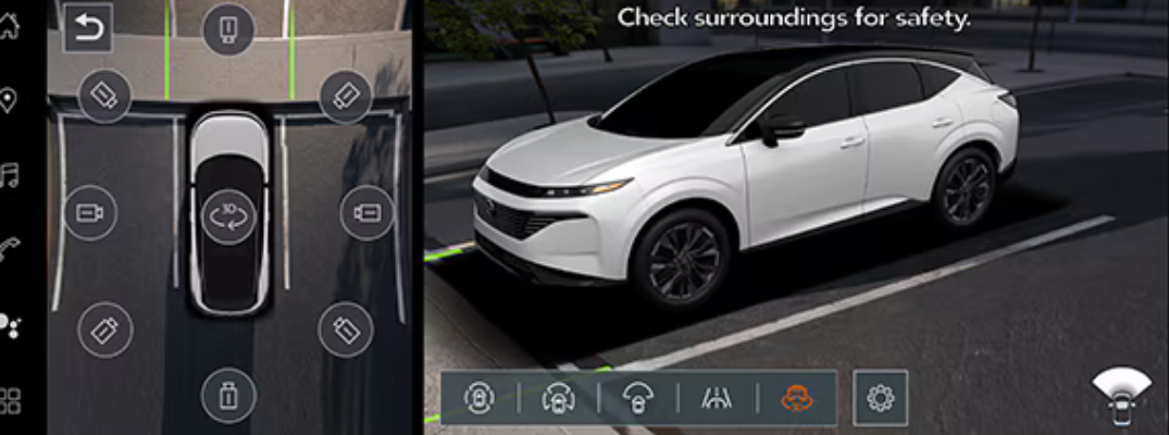 The 2025 Murano offers four available camera views which can be combined to create a composite birds-eye view of the SUV and its surroundings. You can also take a look at split-screen close-ups of the front, rear, and curbside angle of the vehicle, to help you maneuver into tight spaces, or through narrow streets.